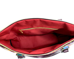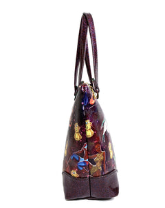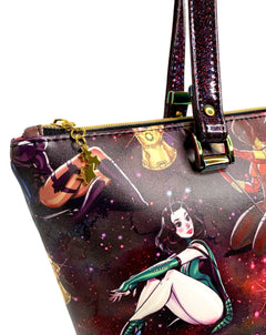 This stylish custom handcrafted handbag features the stunning artwork of Andrew Tarusov. The lovely ladies of Avengers Infinity War are featured on this beautiful faux leather print. The characters on this custom print include: Black Widow, Mantis, Scarlet Witch, Valkryie, Gamora, Nebula, Nakia and Okoye. The handles and bottom accents are made with a purple and red glitter vinyl. The bottom has five purse feet to help protect the base of the bag. The bag is interfaced for structure.