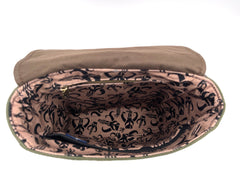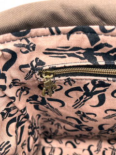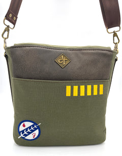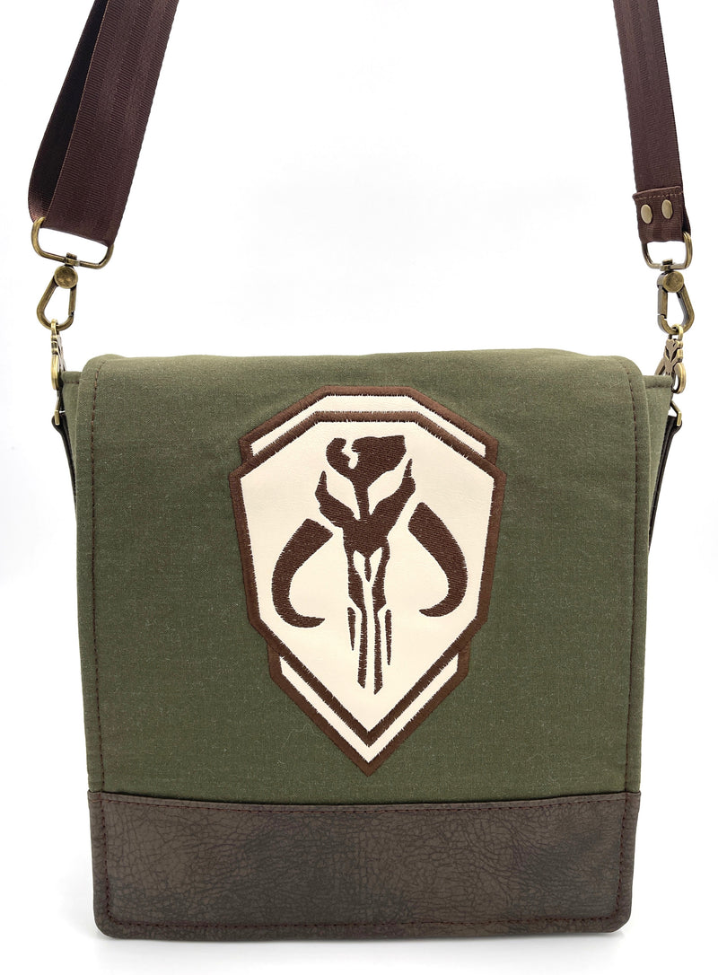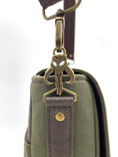 Walk proudly on the streets of Mos Espa with your new Boba Fett inspired messenger bag. This bag is made with heavy duty canvas and faux leather. The front flap features an embroidered Mythosaur Skull symbol and closes with two magnetic snaps. The back has a convenient slip pocket embroidered with Boba's signature helmet stripes and iconic chest symbol. The inside has one slip pocket and one zippered pocket with a custom Mythosaur zipper pull. The interior is made with 100% cotton canvas. The crossbody strap attaches with custom Mythosaur Skull strap connectors.