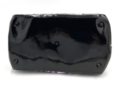 This bag measures approximately 8" high, 12" wide at the top, 10.5" wide at the base and 6" deep. The black patent vinyl handles measure 24” and have a 9” drop.