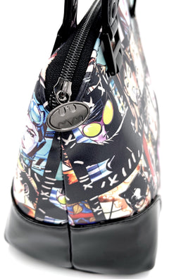 The exterior is made from faux leather vinyl featuring comic images of Catwoman. Black patent vinyl accents the corners of this exclusive bag. Five purse feet protect the bottom of your bag. The hardware is all metal with a matte black finish. The top zipper closure features a custom Batman zipper pull.