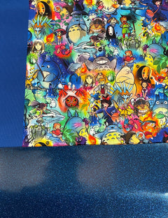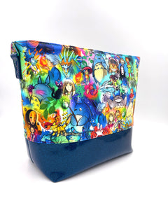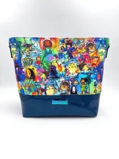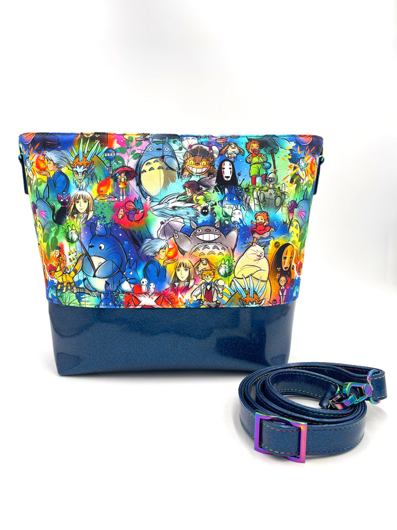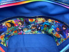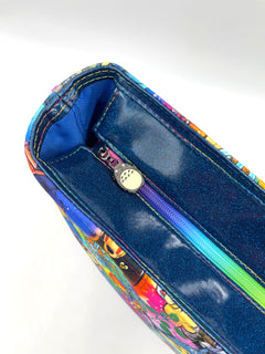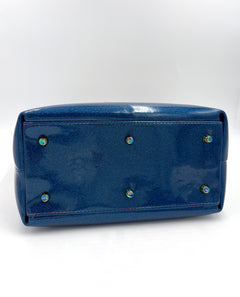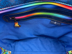 Cotton canvas Studio G exterior with blue glitter vinyl bottom. The hardware is all metal in a rainbow finish. A recessed zippered top keeps everything stored safely inside. The bottom has six purse feet to help protect the base of the bag. The bag is interfaced for structure.