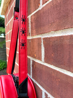 - Adjustable red and black strap with three embroidered spiders