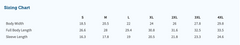 | Full Body Length | 26.6 | 28 | 29.4 | 30.8 | 31.6 | 32.5 | 33.5 |