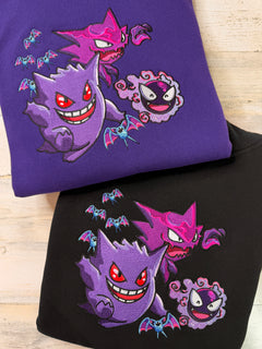 Custom embroidered sweatshirt featuring Gengar, Ghastly and Haunter on the front and a pokéball and zubats embroidered on the right sleeve.