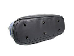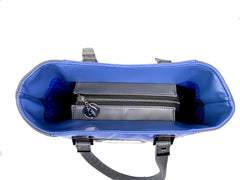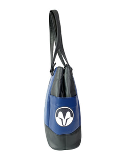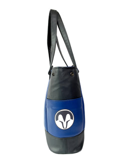 The exterior is made from high quality and durable marine vinyl. This bag features two side slip pockets with the Nite Owls emblem. The bottom has six purse feet to help protect the base of the bag It has a recessed zipper closure and snap closures on the sides. The zipper has a custom double-sided zipper pull with the Mudhorn on one side and the Mythosaur on the other. The hardware is all metal with a glossy gunmetal finish.