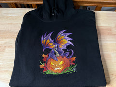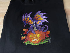 Custom embroidered hoodie/sweatshirt featuring a purple dragon on a Jack-o-Lantern on the front.