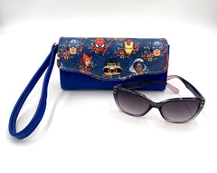 The flap is made from custom cotton canvas featuring your favorite Marvel characters and coated in a waterproof gel coating. The exterior and wristlet strap are made from high quality blue marine vinyl. The interior is made with navy 600 denier waterproof canvas and the same custom cotton canvas floral Marvel fabric coated with OdiCoat.