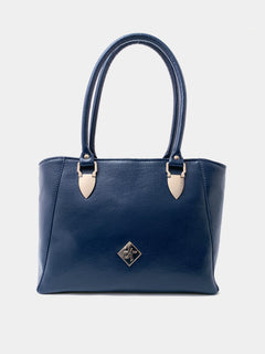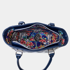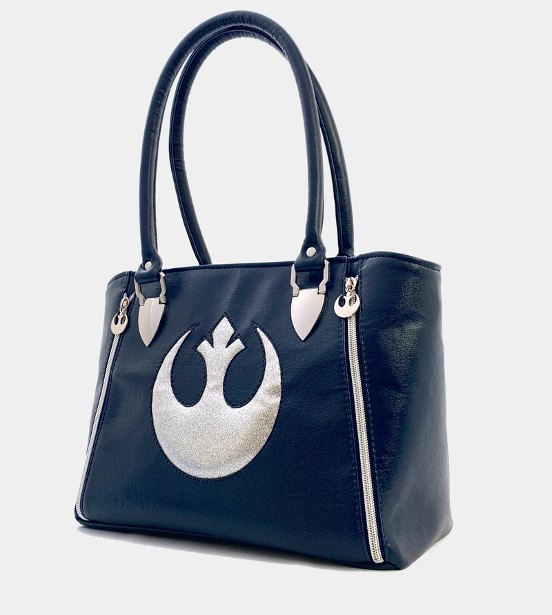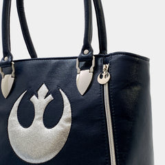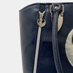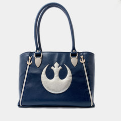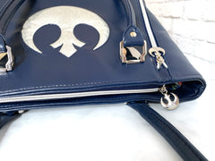 The exterior is made from high quality and durable navy blue marine vinyl. The Rebel Symbol has been reverse appliqued in silver glitter vinyl to the front. Five purse feet protect the bottom of your bag. There is a large zipper pocket on the front of the bag that extends from one side to the other and features two custom Rebel Symbol zipper pulls. It has a recessed zipper closure with a custom Rebel Symbol zipper pull. The hardware is all metal with a glossy nickel finish.