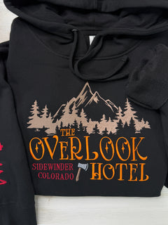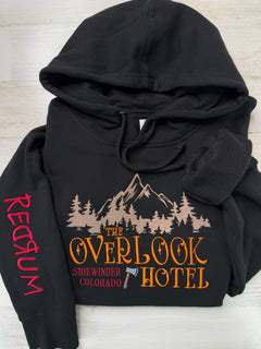 Custom embroidered sweatshirt featuring an Overlook Hotel design the front and Redrum embroidered on the right sleeve.