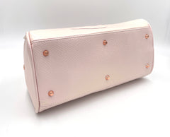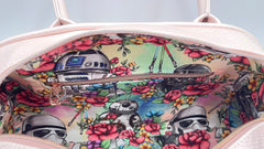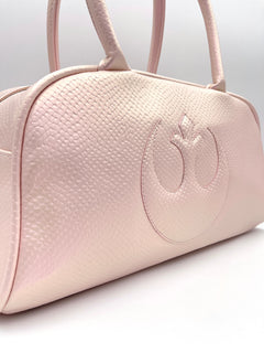 Flaunt your Star Wars passion with this Chanel inspired Rebel Bowler Bag. The pink scaled vinyl has a beautiful shimmer and a very elegant look and feel! The Rebel logo is appliquéd onto the front in the same beautiful light pink vinyl. Rose gold hardware perfectly accents the bag.