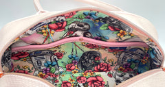 * Please note, this is a light colored bag. Even though it is vinyl and can be wiped off, it can still stain. Dye from denim jeans and other clothes can sometimes rub off so keep that in mind when wearing your bag. Once the vinyl is stained by the dye, it can't come out of the vinyl.
