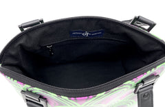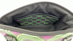 The interior is made from 600 denier black waterproof canvas. There is one zippered pocket and a slip pocket. The slip pocket features the same Room 237 design as the exterior.
