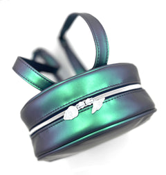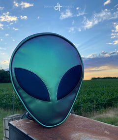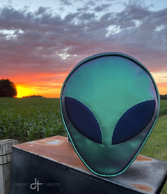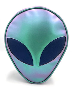 - Top zipper closure with custom glow-in-the-dark alien head and UFO zipper pulls.