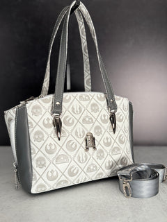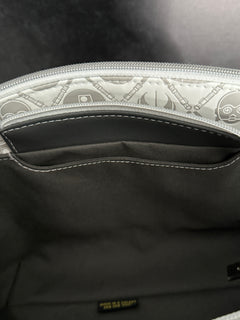 - Dual top zipper pockets frame an expandable enclosed interior with a slip pocket
