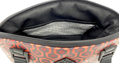 The interior is made from 600 denier black waterproof canvas. There is one zippered pocket and a slip pocket. The slip pocket features vinyl that repeats the phrase "All work and no play makes Jack a dull boy."