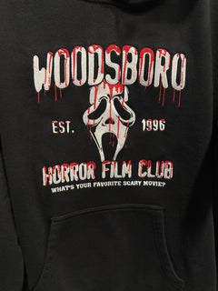 Black hoodie with front embroidery featuring a Woodsboro Film Club design.